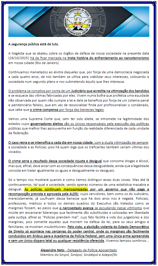 A tragédia que se abateu sobre os órgãos de defesa de nossa sociedade na presente data (28/10/2025) há de ficar marcada na triste história do enfrentamento ao narcoterrorismo em nossa cidade (Rio de Janeiro).