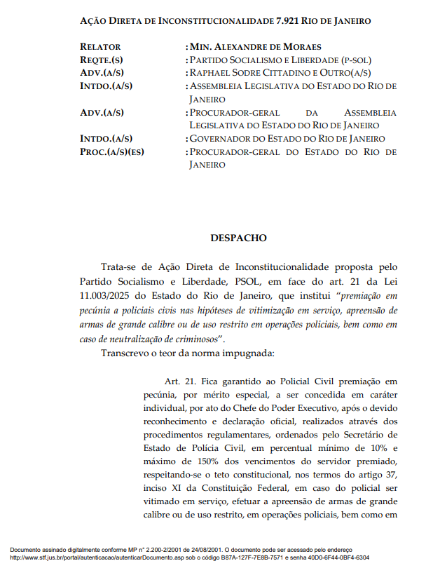 Trata-se de Ação Direta de Inconstitucionalidade proposta pelo Partido Socialismo e Liberdade, PSOL, em face do art. 21 da Lei 11.003/2025 do Estado do Rio de Janeiro, que institui “premiação em pecúnia a policiais civis nas hipóteses de vitimização em serviço, apreensão de armas de grande calibre ou de uso restrito em operações policiais, bem como em caso de neutralização de criminosos”.